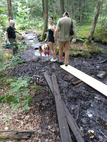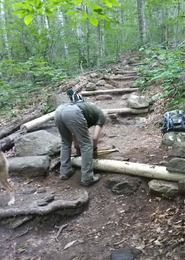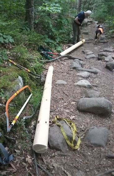 Today's crew was two: Ben and TM Craig. We toted pick, shovel, screw gun, and hammer uphill around 0930. We also lugged 2 2x6x8' KD premium planks. We came to log steps uphill of the flat beyond Firepond Brook around 1015. There we recovered logs we left there on our last workday 7/3, an 8' and a 6' peeled fir. They replace steps we built there in 1989. Mind, others there we replaced in 2022 and earlier. A wide trail means much woodwork in New England. While we were setting logs, three ascending hikers offered to lug the planks up to the bog bridge. They are Gabriella, Rog, and Ro... They were as good as their word. Thank them all.