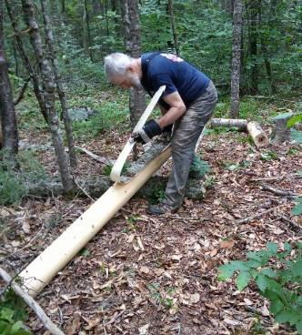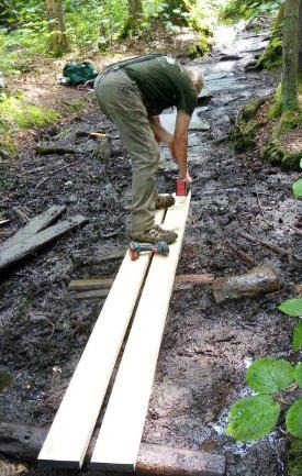 We reached the 1986 bog relo by noon. After lunch we used about half an hour to remove the old rotting 2013 planks and screw down the new ones. The R&R itself took about ten minutes, then we pulled 16d nails from the old planks for recycling and threw the planks into the woods to finish rotting.