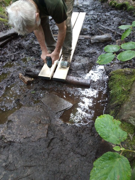 Of special note: the 2013 planks sat on sills 2' long cut from landscape timbers. Being in a bog and wet all the time, they were still sound. We turned them over and screwed new planks down with deck screws.