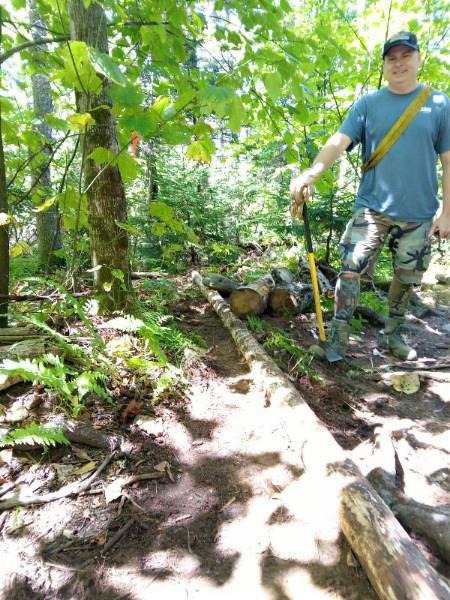 As we all enjoy 70s and a NW breeze after weeks of 90s and stifling humidity, Kevin and TM Craig had three hours this morning. We hiked uphill over many fixtures built by us and by two earlier crews until we came to the first flag from our survey of 2023 that was as yet undone. It called for a new waterbar at the top end of a gully. We built stone steps there in 2023, and now we might divert stormwater from the trail off into the woods where it seeps into the ground.
